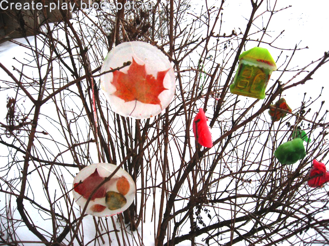 Утром вода в формочке застыла. Бегом на улицу - украшать деревце!